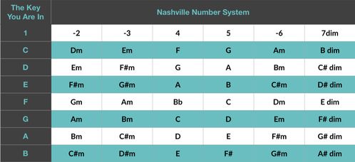 - Example: If you are in the key of G, the G Major scale would go as follows: G, Am, Bm, C, D, Em, F#dim, and then back to G. Applying the number system to this would look like:
